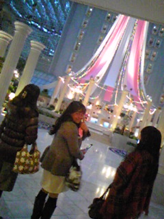 写真は、ホテルに到着しロビー吹き抜けを見上げる楽しい仲間達。