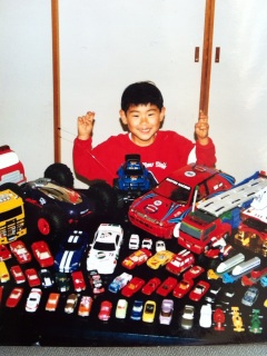 たくさんのミニカーをテーブル一面に並べ、ピースサインでご満悦の一枚。